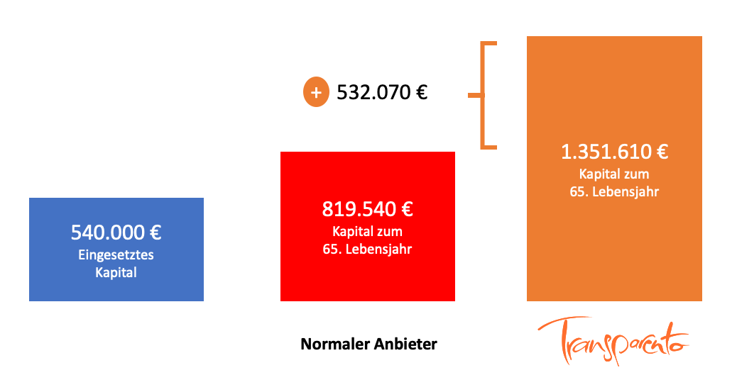 Stell Dir vor, Du sparst für Deine Altersvorsorge (Fondssparplan) monatlich 1.500 €, d.h. Du zahlst in Deine Geldanlage 540.000 € ein.