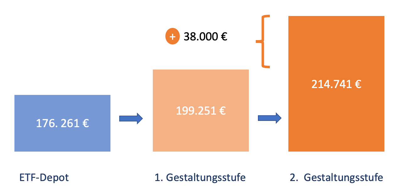 Bei 100.000 € Kapitaleinsatz kannst Du z.B. bei 20 Jahren Anlagedauer ein zusätzliches Mehrkapital von ca. 38.000 € erreichen.